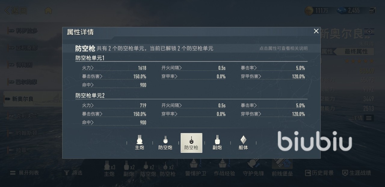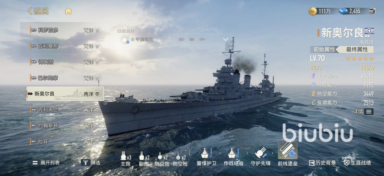 在属性方面,新奥尔良最大的优势就是自身防空能力直接拉满,这得益于拥有两座防空炮和两座防空枪,这样形成的交叉火力,可以快速打掉对方攻击过来的鱼雷机或者是轰炸机,是整个团队防空的主力。生存能力也比较优秀,对舰能力中规中矩,最差的是反潜能力。火力输出方面拥有三座主炮和两座副炮,齐射时可造成可观的输出,但相比于战列舰还要逊色一些。友方舰载机出动四次,新奥尔良就可以给自身添加临时装甲,提高生存能力。在布阵的时候一定要把它放到前排,因为这样可以提高主炮火力,当防空打出暴击时,还有几率使下一轮主炮暴击率提升。