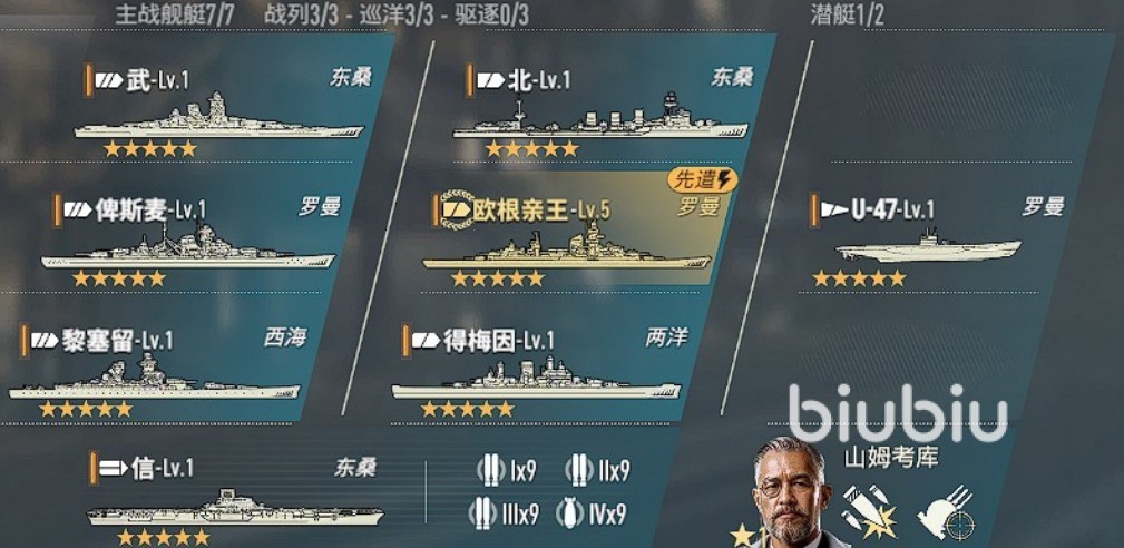 阵容组成:武+北+俾斯麦+欧根亲王+U-47+黎塞留+得梅因+信