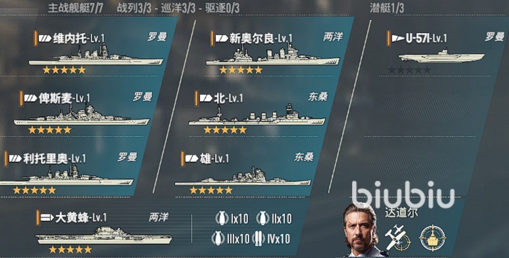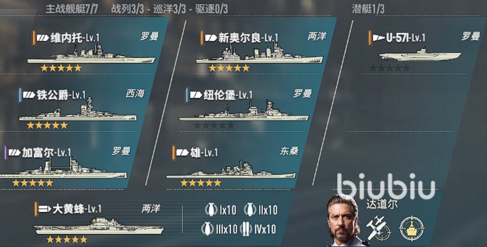 阵容组成:维内托+新奥尔良+U-571+铁公爵+纽伦堡+加富尔+雄+大黄蜂