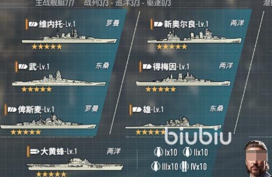 3战3巡1航1潜的配队,后排维内托、俾斯麦、武,前排新奥尔良、得梅因、雄,还有大黄蜂和小鲨鱼。这套满编阵容是围绕着两洋为核心构建的,并且有多阵营联动,输出很全面,可以激活两洋灯塔,获得全队火力和舰载火力加成。