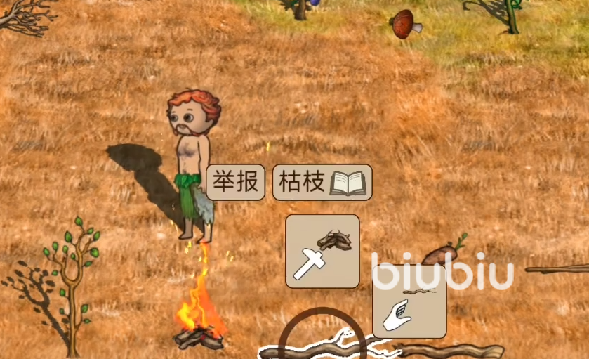 然后用燧石和树枝进行交互,之后便可以烧起来。然后将其给放在堆好的树枝上,这样便可以形成火堆了。有了火堆之后哪怕是晚上也不用担心会受到野兽的入侵。同时我们之后打猎所获取到的生肉也都可以制作成熟肉,这样体质便不会怎么下降了。