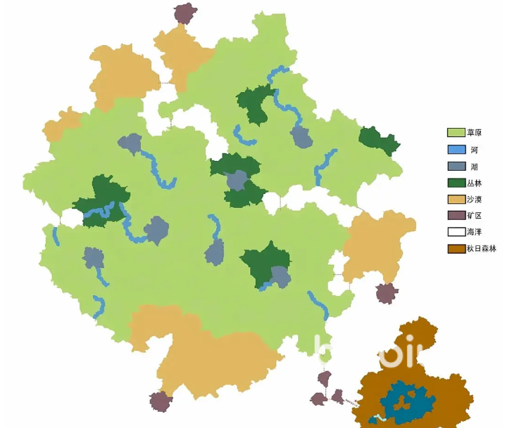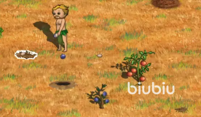游戏有6种地形分别是海洋、秋季森林、平原、雨林、沙漠和矿区,平原通常是村民们的出生地,同时也是获取食物的主要地区,该地区地势平缓温度适宜,跑动或劳作不会有温度上的大变化,动物有恐鸡、野生斑羚、跳鼠等,植物有托马果树、番薯等,基本上基础物资都可以优先在此采集。
