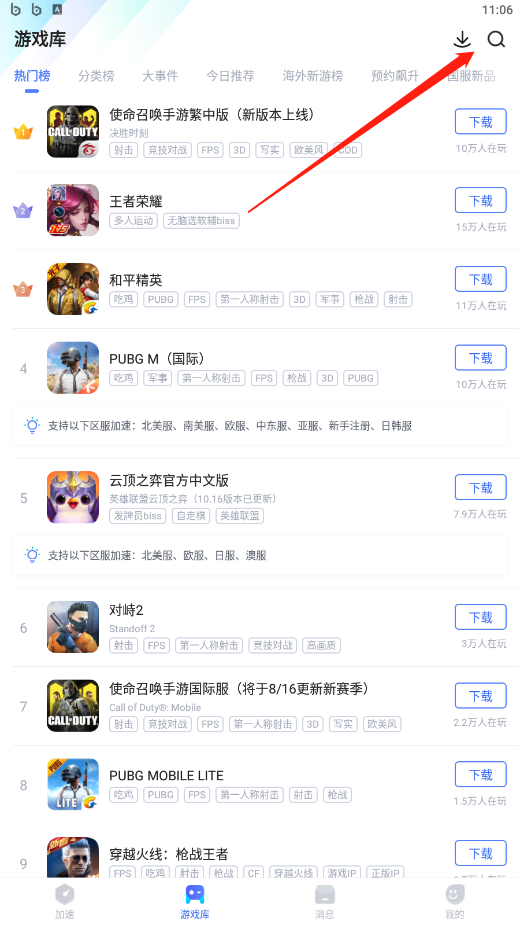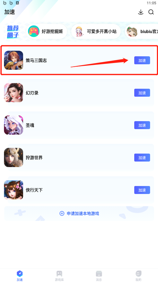 此外,玩家在第一次下载并安装游戏后,biubiu加速器的首页会留存玩家手机中以及曾经加速过的游戏,下次需要加速时,从首页直接点击游戏名称右边的加速按钮就可以快速的完成加速了。