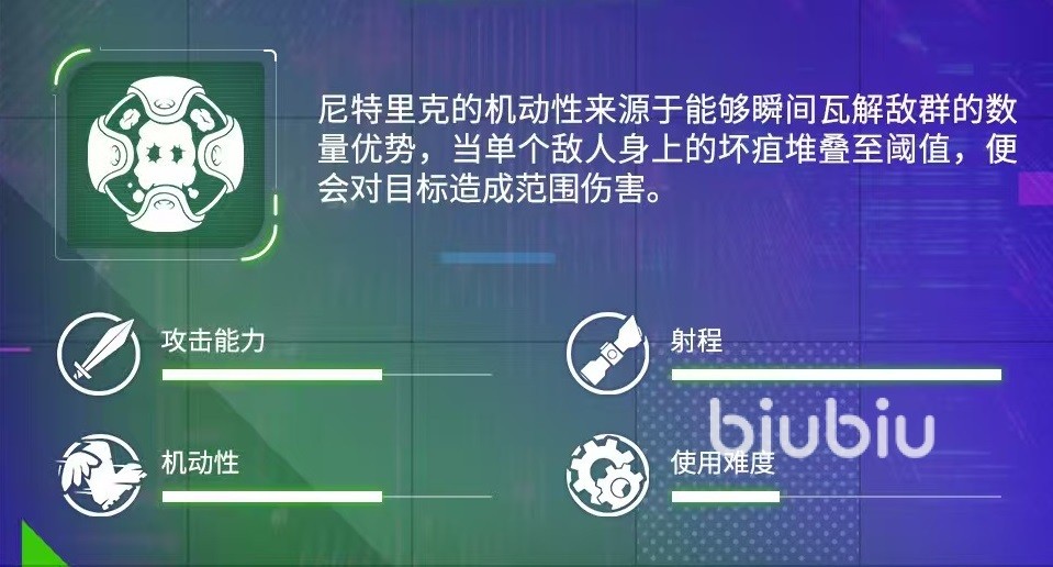 所以这个角色的特点并不是瞬间爆发,而是不断的进行数值积攒,进而使对方逐渐崩塌。在实战中,尼特里克的机动性主要来源于瞬间瓦解敌群的数量优势,当单个敌人身上的坏疽堆叠到可以爆发时,就可以对目标造成范围伤害。如果是在一些需要爆发的场合下,这个角色并不适用,但是在需要持续输出的战斗中,效果会很出色。