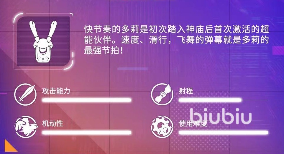 多莉是初次踏上神庙后首次激活的超能伙伴,它拥有快节奏的优势,无论是速度还是滑行都是如此。在属性方面,多莉=攻击能力直接拉满,机动性拉满。射程中上水准,使用难度很高。所以这并不是一个新手玩家就可以直接上手的角色,需要有一定的操作基础之后再进行选择。