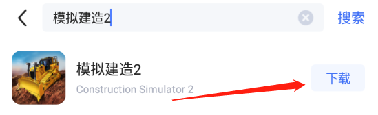 在输入框中输入并搜索“模拟建造2”,即可看到这款手游,点击右侧蓝色的下载按钮。