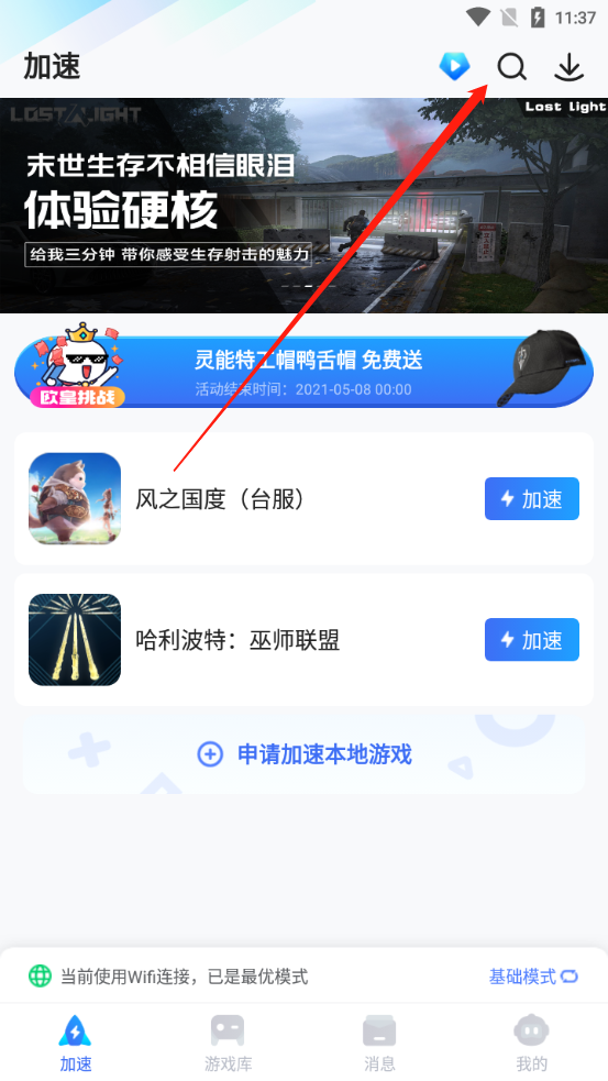 首先打开biubiu加速器,在首页的右上角有个如下图所示的图标,点击进入。