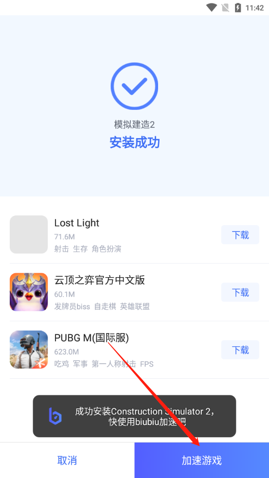 安装完成之后我们再回到biubiu加速器首页,重新加速模拟建造2并打开就可以正常运行了。