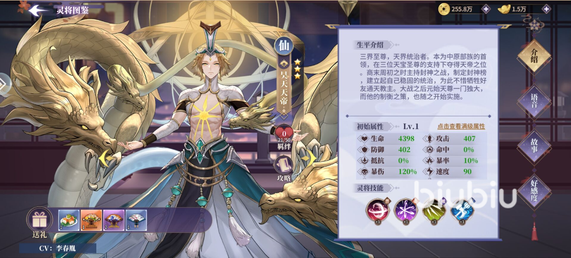 3、天帝之威:天天帝在场时,我军必杀技伤害增加10%,升星可以带来额外效果。