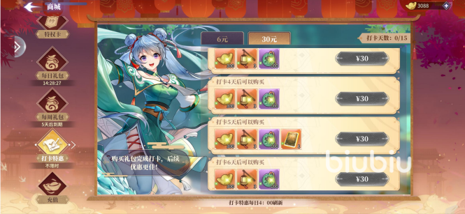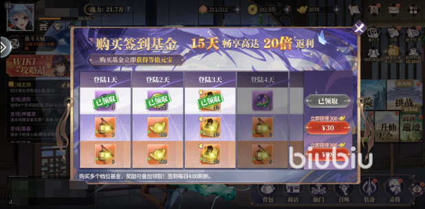 2、购买后打卡可以获得额外的元宝,以及三个引魂灯和100的灵玉。连续5天打卡能直接得到一张金色的神话卡。累计14 天可以获得三族自选灵将箱,打卡的天数越多奖励就会越好。