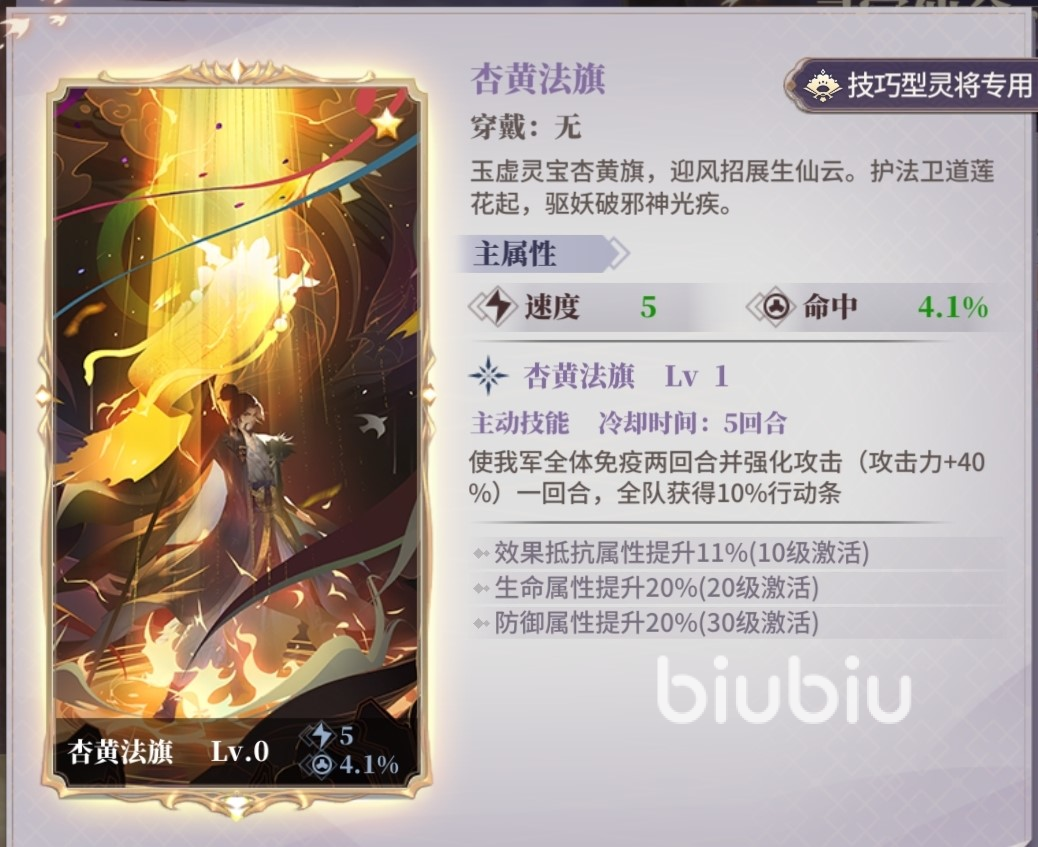 3、杏黄法旗:主属性为速度/命中,副属性为抵抗/生命/防御。技能效果为使我军全体免疫两回合并攻击,并全队拉条。获取途径为分宝岩抽取/兑换。