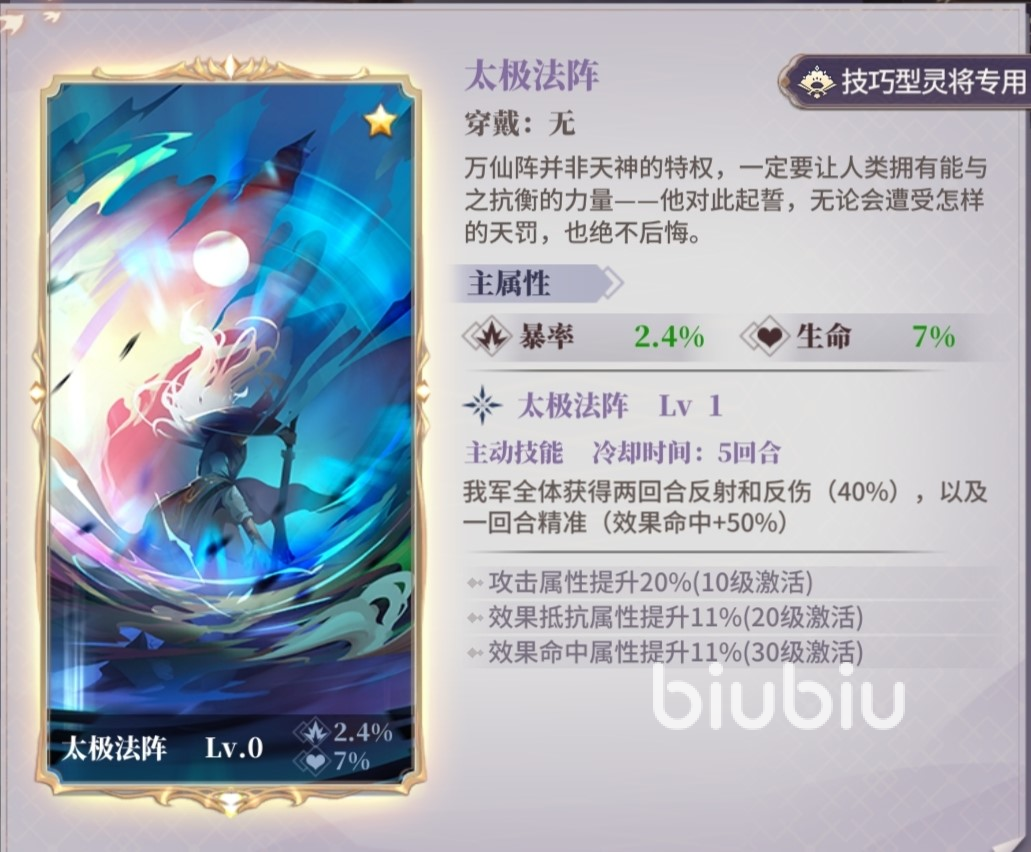 4、太极法阵:主属性为生命/爆率,副属性为攻击/抵抗/命中。技能效果为我军全体获得两回合反射和反伤,以及命中。获取途径为分宝岩抽取/兑换。