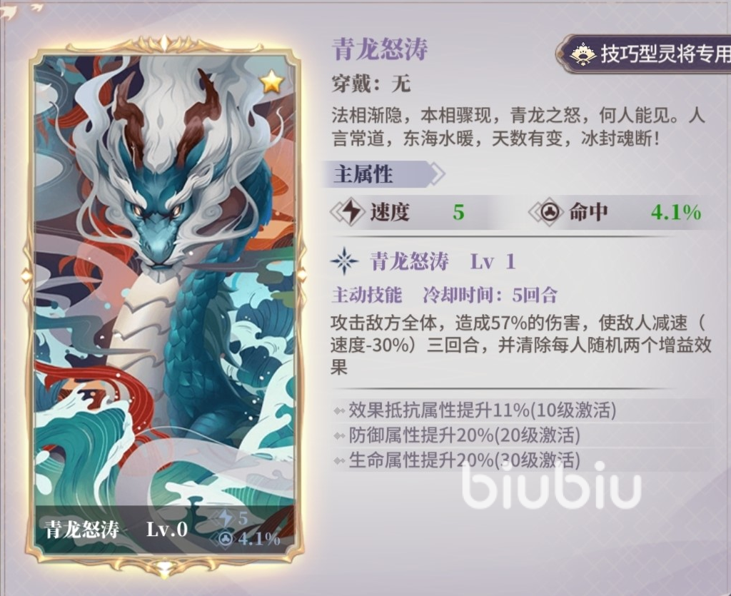 1、青龙怒涛:主属性为速度/命中,副属性为抵抗/防御/生命。技能效果为攻击敌方全体造成的伤害,使敌人速度减少三回合,并随机清除两个增益效果。获取途径为青龙限时UP220抽,分宝岩抽取/兑换。