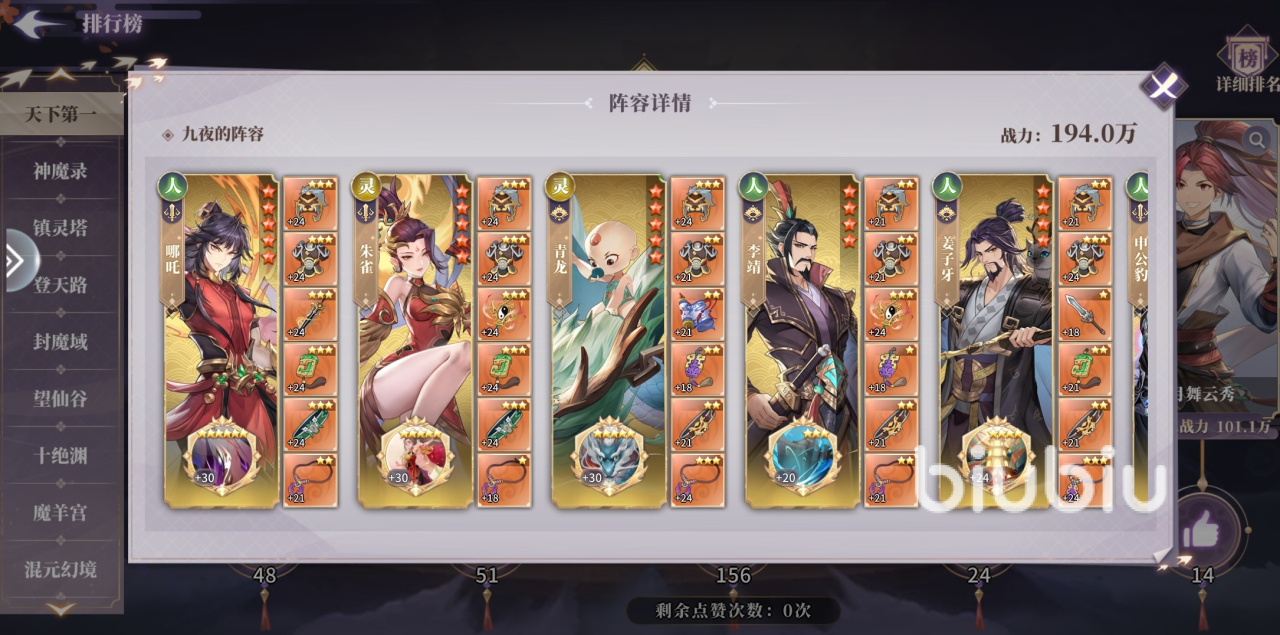 2、速度极快,先手团控的青龙和单体爆发,速度成长的雷震子,保证一个先手的操作,输出极高,攻无不克的通天教主和进攻辅助,全队增伤的昊天天帝,提供稳定的输出,克制暴击,控制充足的敖丙,为团队辅助。