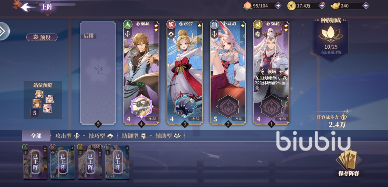 4、玩家可以将五人阵容慢慢拉配置成一种族,也可与灵族角色混合搭配,这样可以享受到所有的种族加成效果。