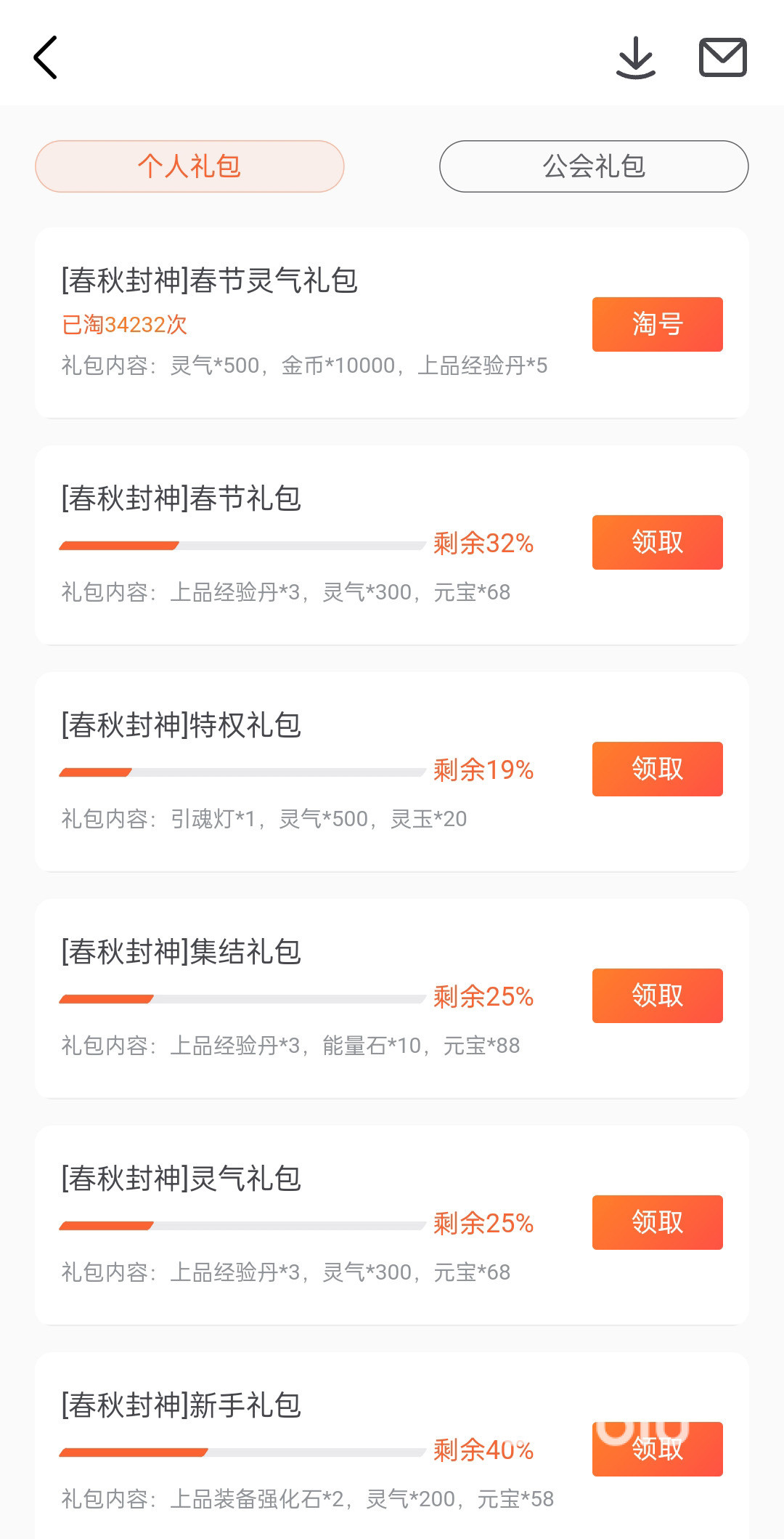 包括个人礼包和vip礼包在内的合计14份,其中个人的目前大多还剩1/4,大家抓紧时间领了,有一些已经进入淘号阶段了。所谓淘号是指领了但没用的在一段时间后会被收回,大家可以多试试看看有没有还没被用掉的。