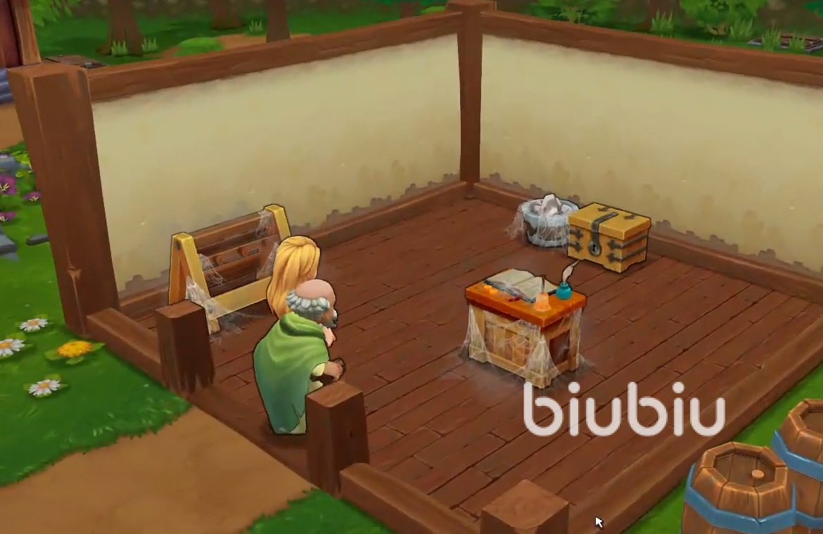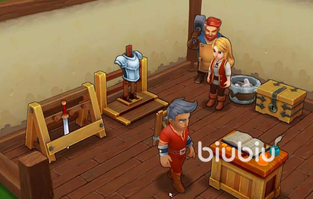 这款游戏一开始进入的时候咱们需要设置一下主角的形象和名字。在设置完毕之后便可以正式进入游戏。在游戏里面咱们跟随欧文长老首先来到一处很破旧的建筑里,他会让我们先将这个屋子给打扫一下。我们给房间的每一个物品点击几下便可以将这些物品的灰尘给清理掉。在清理掉一半的时候铁匠会过来进行拜访,同时还送给了我们一把学徒短剑的图纸。在拿到图纸后咱们便可以解锁打造。