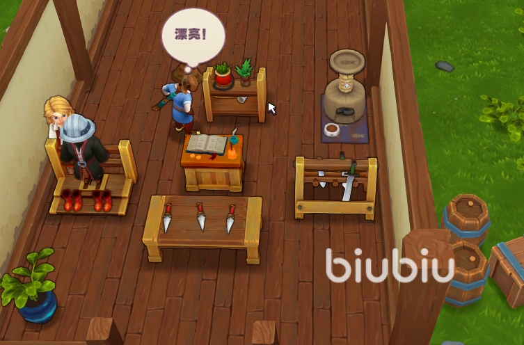 游戏里面顾客基本上都是咱们有什么他们买什么,咱们在前期给客户准备的商品尽量选择武器类型的比较好,因为武器类型的商品卖价会高一些,同时它们所需要的打造资源还比较少,可以说是性价比最高的贩卖方式。
