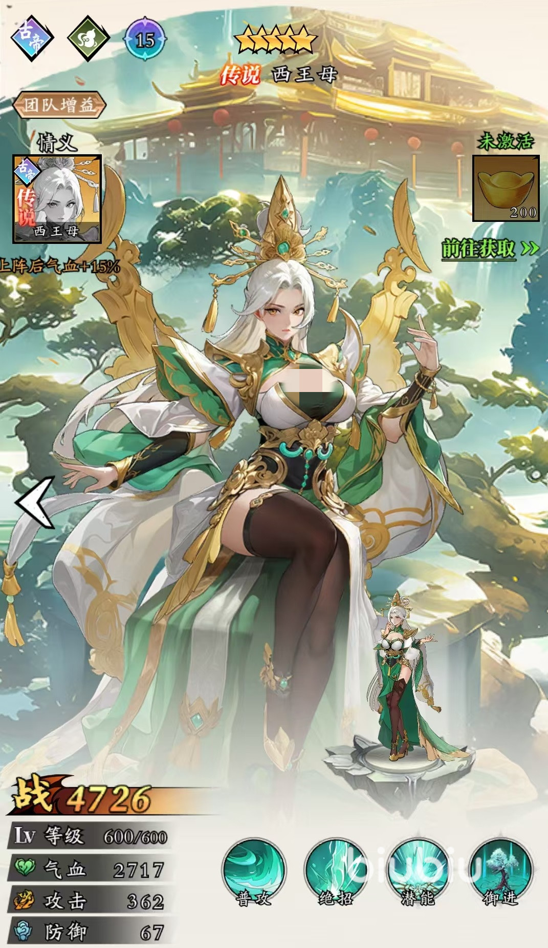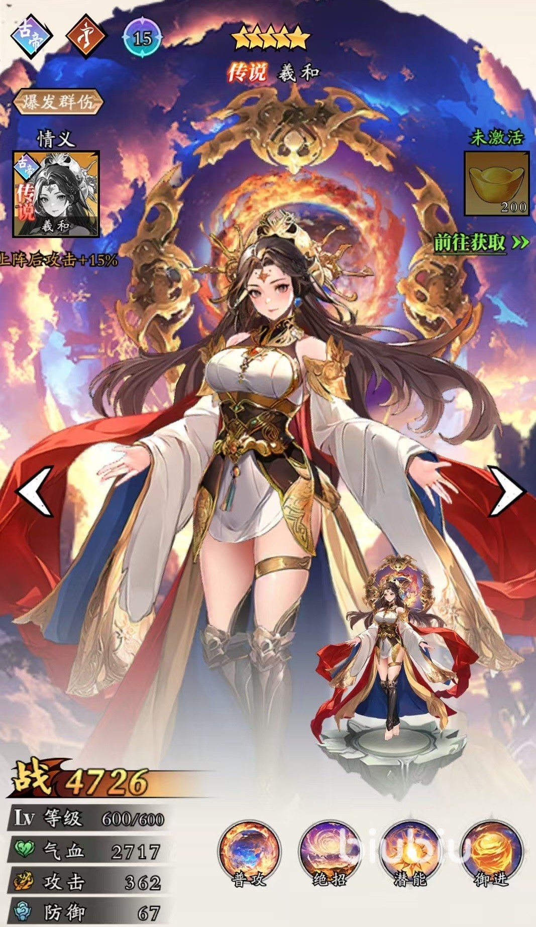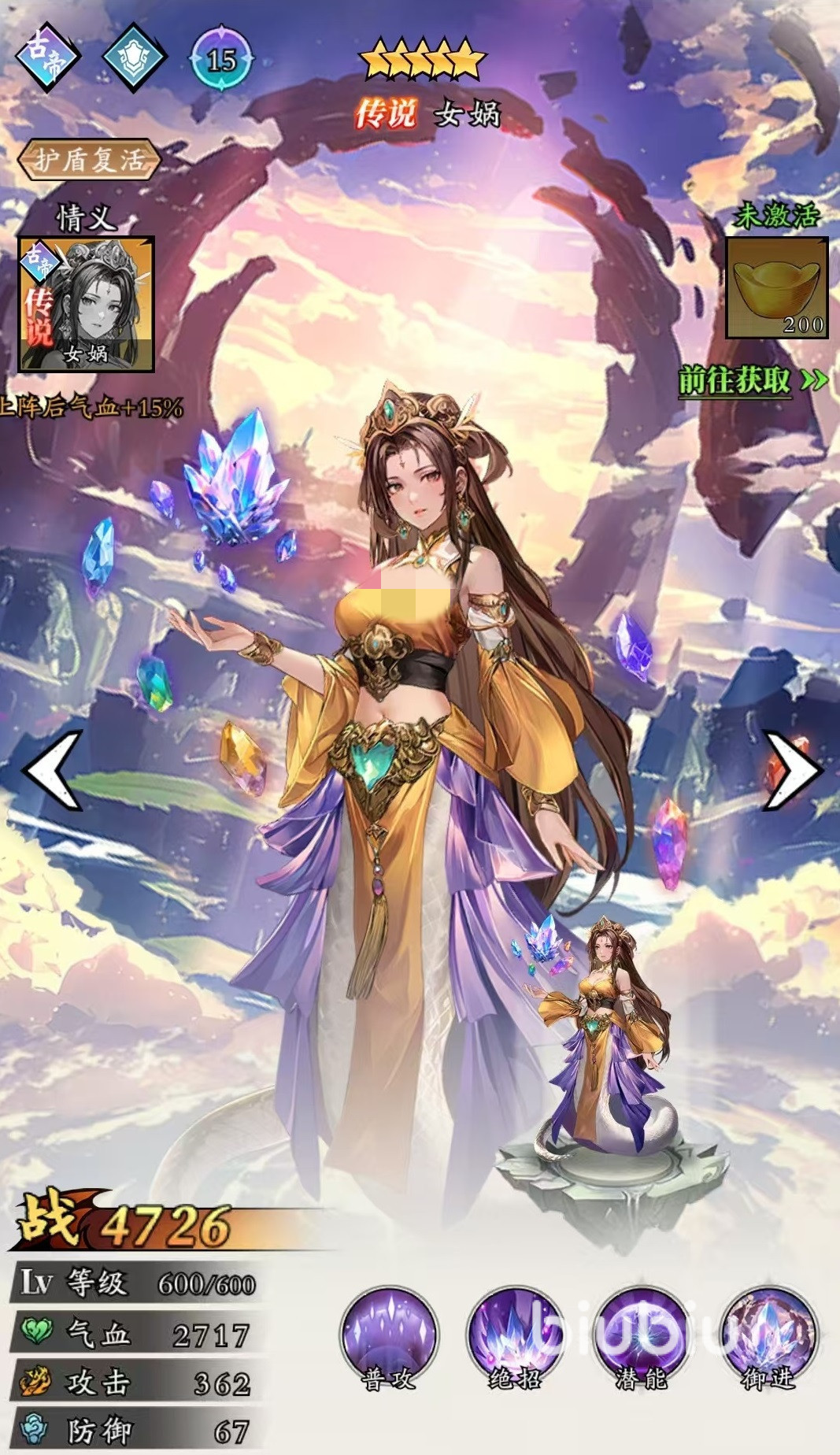 游戏在阵容搭配方面选择的是6人出战模式,如果可以选择上阵同朝代的6名豪杰,那么生命值和攻击力都能获得大幅度提升,所以小编选择的就是六人全古帝的阵容。站位方面分为前排和后排,在前排小编选择的是蚩尤、炎帝和伏羲,后排选择的是女娲、羲和、西王母。先来看一下后排这三名女性角色,女娲是很好的辅助,拥有护盾复活等机制。绝招可以攻击对方全体,造成伤害的同时,有几率将我方全体单位身上的减益状态清除,如果成功清除掉,额外再获得20%的伤害减免。在达到十一星之后,释放技能可以给血量最低的友方单位额外添加无敌盾。
