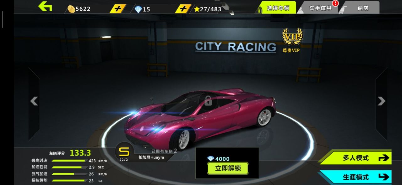 最后这辆跑车是目前游戏里的速度之王,暗红色的赛道野马——帕加尼Huayra,最时速为惊人的四百二十三千米每小时,估计再快些就可以起飞了,该车的外形十分酷炫,配合暗红色的色调,在游戏中视觉体验极佳,如果玩家钻石充裕的话,十分建议将其收入麾下,定能在赛道上立下汗马功劳。
