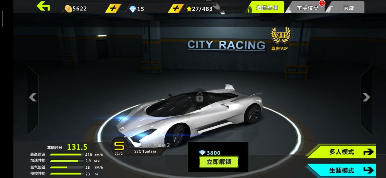 而第二辆我们来看一看SSC Tuatara,同样是跑车,但相对上一辆来说,该车在车型的设置上更为优异,接近完美的空气动力流线车型,使得车速在直线赛道上可以迅速提升,最高时速可达四百一十八千米每小时,而且该车的操作舒适度更强,二十三GS的操控性能几乎到达顶值,可以给玩家提供高速度的同时,带来高稳定的控制性。