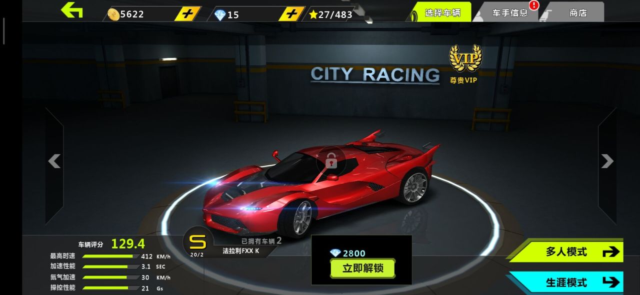 首先第一辆推荐车——S级赛车法拉利FXX K,这是一款性能优异的红色跑车,需要玩家花费两千八百个钻石解锁,其最高时速可达四百一十二千米每小时,极为亮眼。这辆红色跑车整体呈现出顺滑的流线型,搭配赛车尾部的尾翼,以及动力感十足的喷射装置,在赛场上可以展现出大多数无法发挥的极致速度。