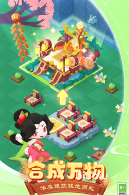 这款游戏主打的是合成类的玩法,我们可以通过合成的方式装扮我们的小岛,这里会有很多的伙伴,例如哪吒、虞姬,很多我们耳熟能详的历史人物在这里都是可以看到,玩家们可以通过合成他们喜欢的物件来获取人物,哪吒就是莲藕,嫦娥就是月亮,每一个人物对应的物品都是不同的,拥有两种合成方式,分别是三合一以及五合二,要合理利用每一个道具,丰富自己的人物以及建筑。