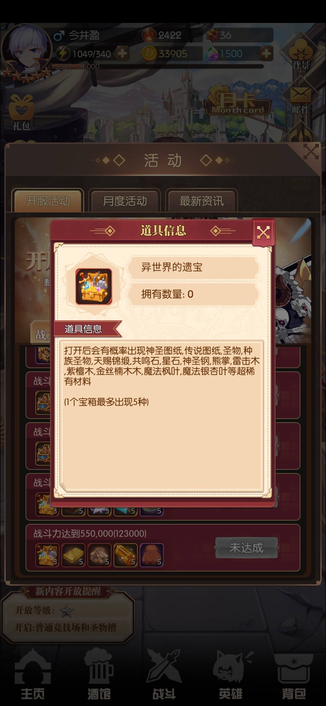 当玩家完成了一些开服活动之后,就能获得各式各样的宝箱包括材料宝箱和异世界的遗宝宝箱,在异世界的遗宝中最多会出现5种包括圣物、天赐锦缎、魔法枫叶等珍稀的装备和材料,能开出什么就到看玩家的运气了。