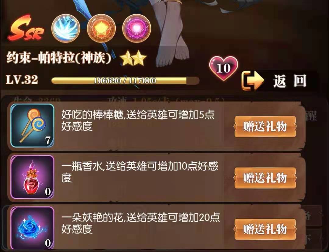 5.提升英雄的好感度,好感度也能增加战力,每一点好感度提升0.01%的属性,虽然这个战力提升幅度很小,但是日积月累的话可不低,在好感度达到999时可以使用誓约之戒结婚,把好感度上限提升至2000,不过每位玩家只能同一个英雄结婚。礼物和誓约之戒都能在商城购买。