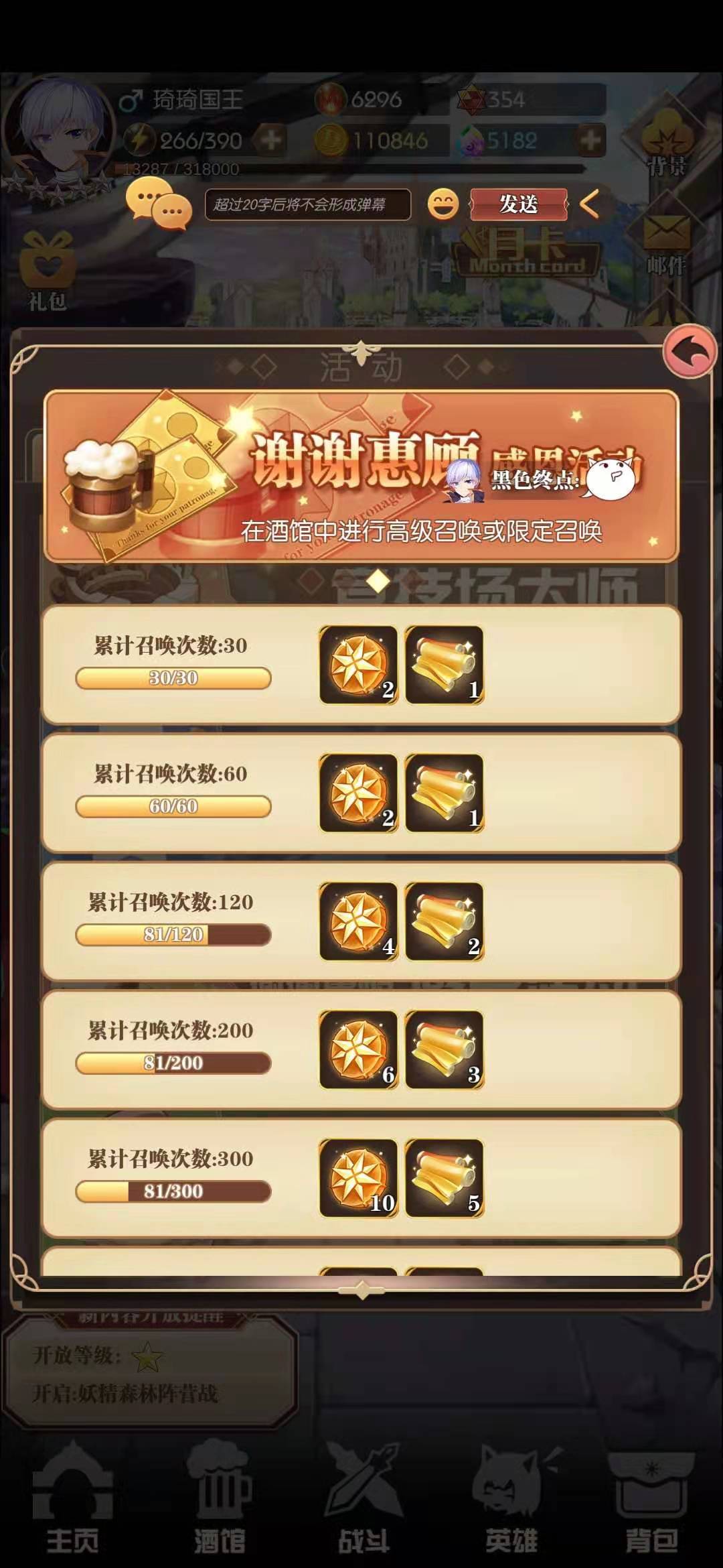 2.感恩活动:在酒馆中进行高级召唤限定召唤累积次数达到30、60、120、200、300、450、800可以获得星石和天赐锦缎。