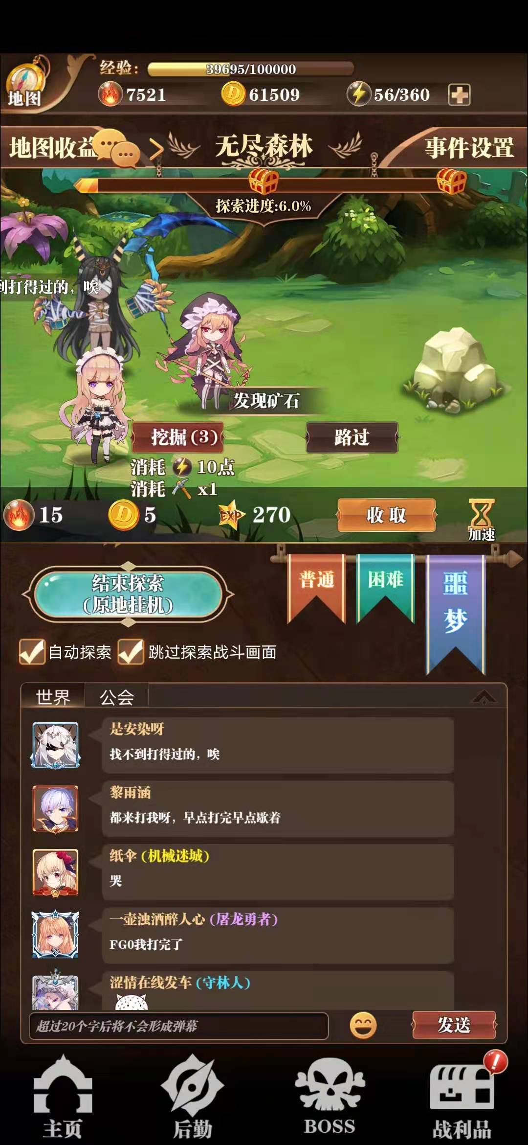 1.战斗:顾名思义就是和野外遇到的怪进行战斗,战胜怪物后可以增加该区域的探索进度,野怪也会随机掉落一些游戏掉落。如果想要早点探索完这块区域的玩家探索时可以选择战斗。