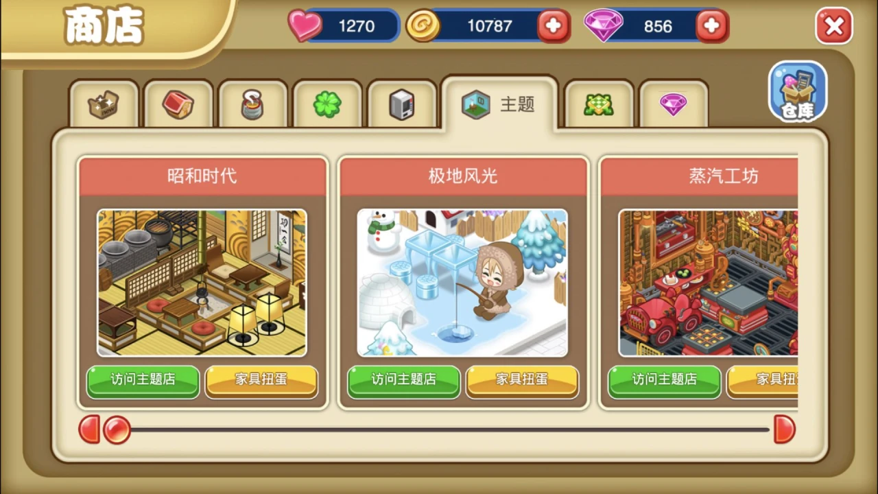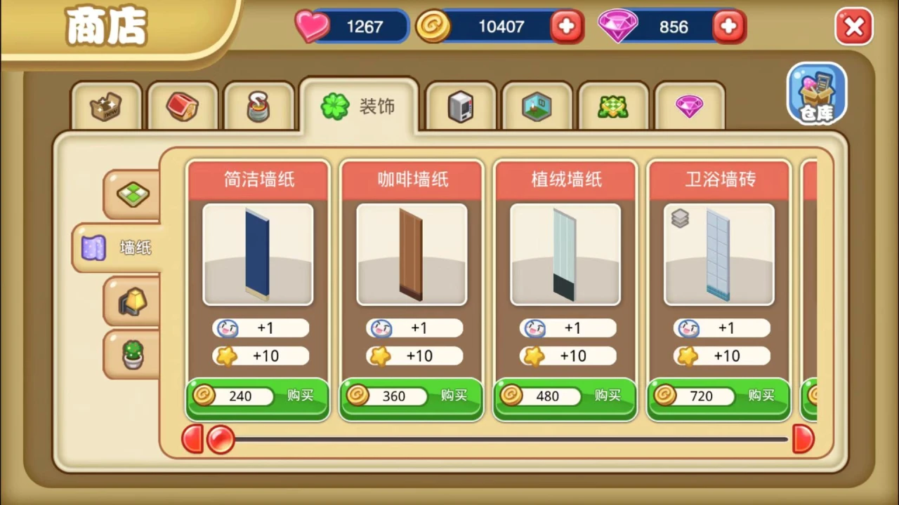 在商店里购买墙纸和地板,将餐厅布置起来。这些装饰并不贵,如果金币足够,还可以购买盆景和墙饰。