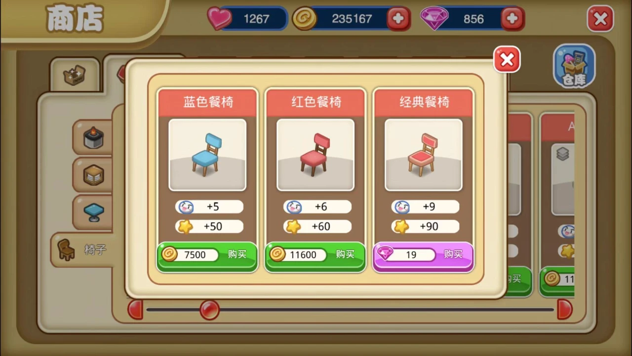 这家萌娘餐厅使用的是最简单的原木桌和椅子,那么我们就要将它升级,更换更高级的设施。