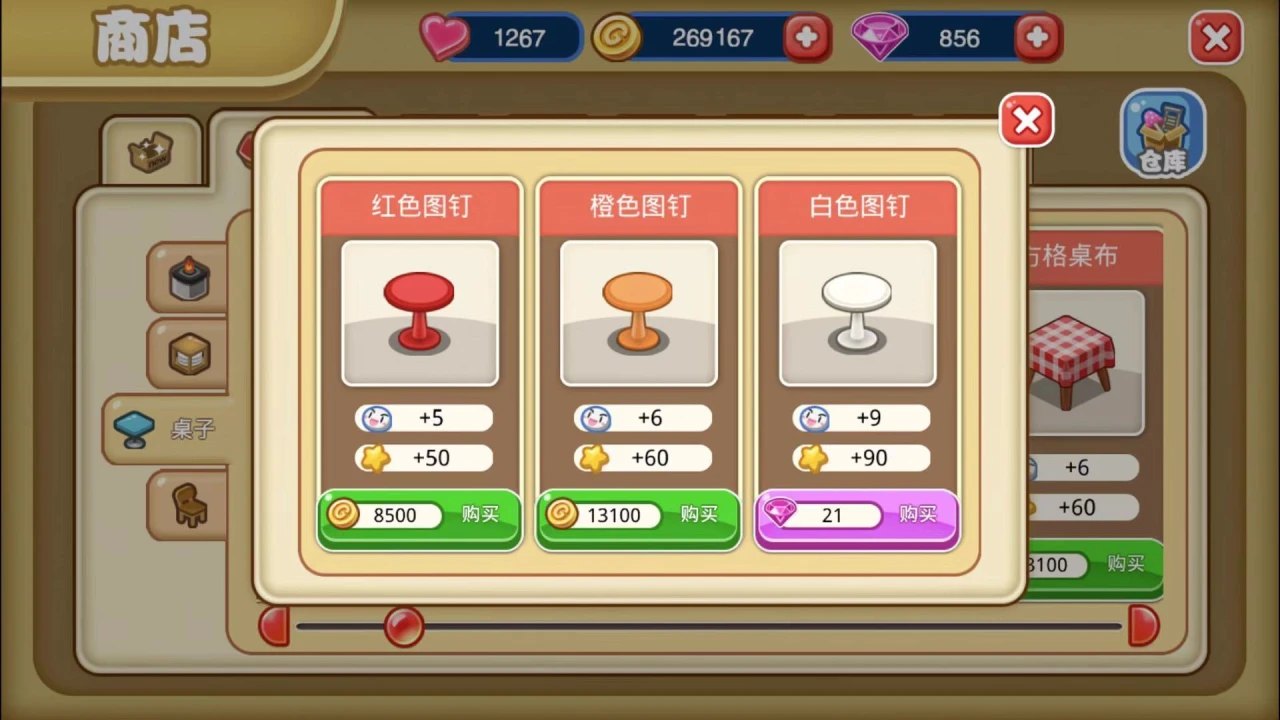点击可以购买各种样式的图钉茶几,选择其中一个即可。购买后可以放置到餐厅里,可以连续拖动购买你想要的数量,然后把之前的原木桌子收纳到仓库里。