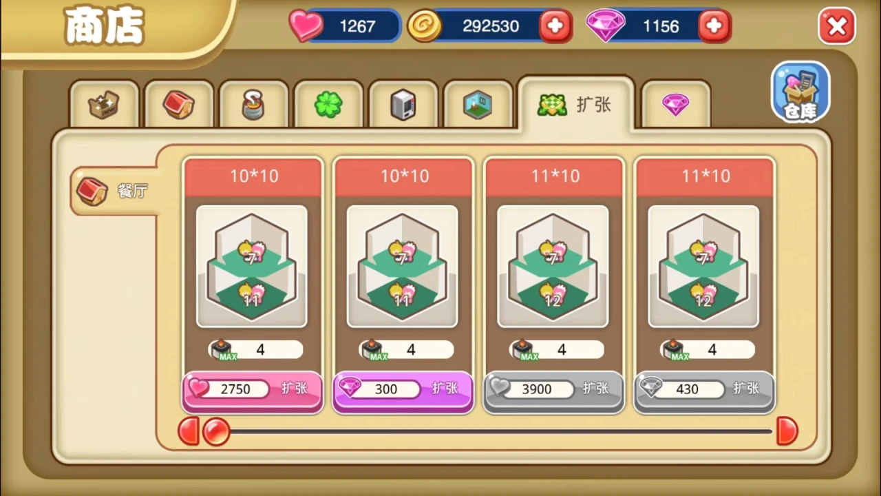 点击【经营】按钮,打开【商店】-【扩张】,由于餐厅面积有限,我们先来扩张一下总面积,让餐厅可以招待更多客人。