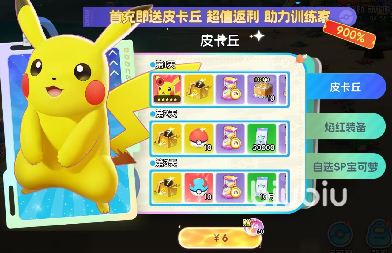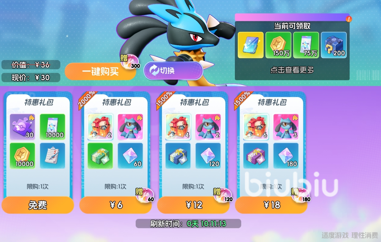 共有一个免费礼包和三个付费礼包,全部买完打折价为30元,玩家可通过切换更改礼包内容,更快培养出自己心仪的宝可梦,还可在超值活动里领取每日首充和连续充值奖励。