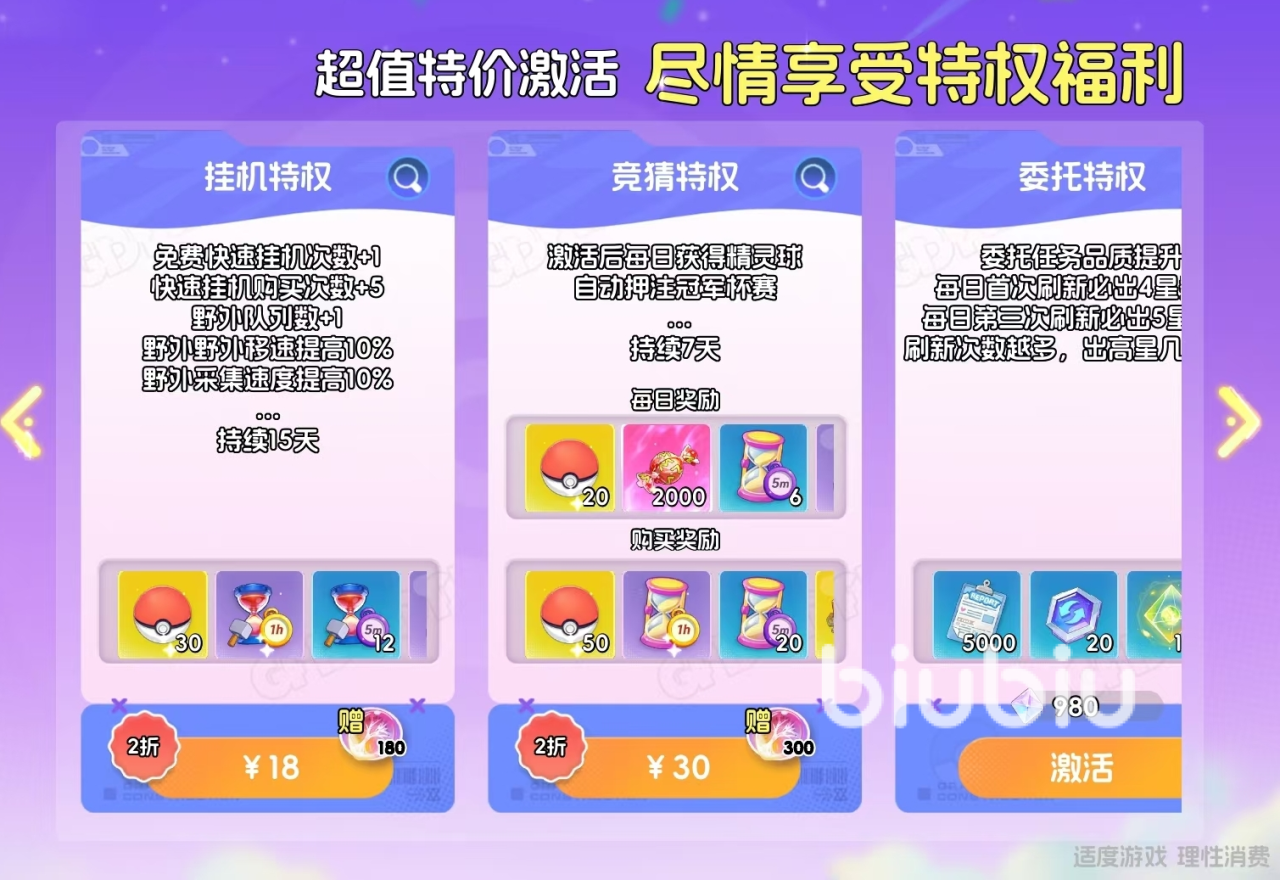 特权分为召唤特权(首充激活)、挂机特权(18元)、竞猜特权(30元)和委托特权(980宝钻),激活后可享受对应的特权福利,还能领取激活礼包。