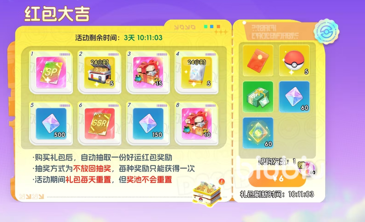 每日6元可抽取一份好运红包奖励,购买8次后可清空奖池,奖池含有SP宝可梦自选卡,极具性价比。