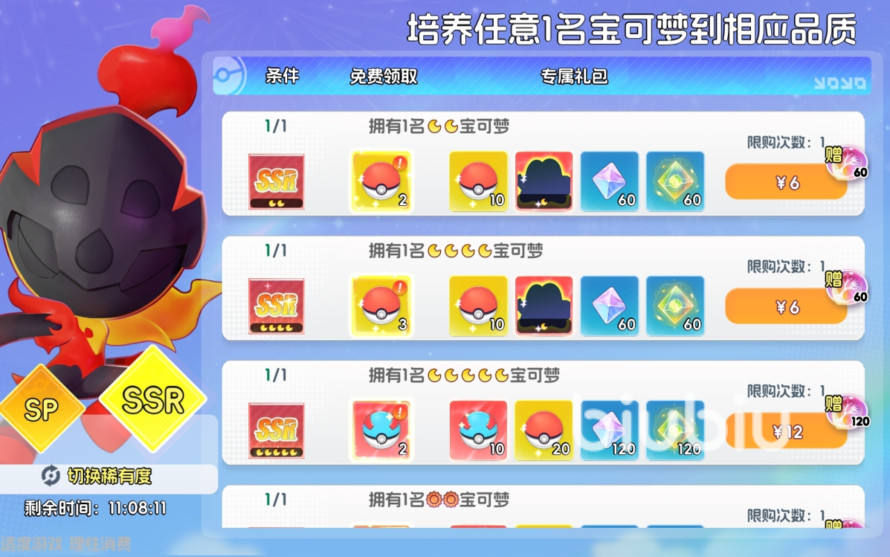 培养宝可梦至相应品质后,可购买成长专属礼包,能更快地提升宝可梦的品级。玩家可在SP宝可梦和SSR宝可梦中任意选择目标宝可梦来进行培养。