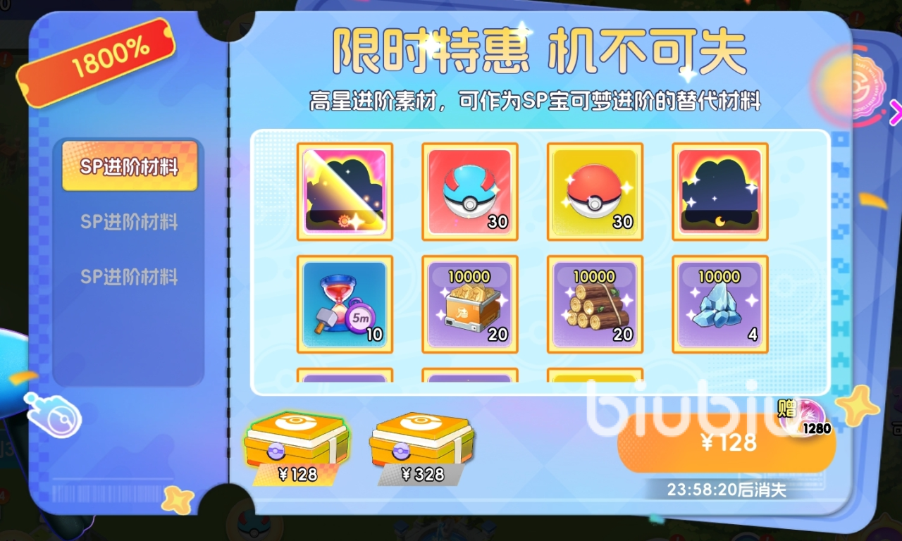 养成宝可梦、参与各项玩法时会出现的特殊礼包,每份礼包均限时出售,时限结束后消失。
