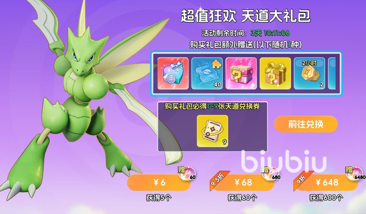 购买天道礼包可获赠主城外观自选箱、随机藏品碎片、食物箱等好礼,每个礼包还能开出1~9张天道兑换券,分为6元(5个礼包)、68元(60个礼包)、648元(600个礼包)三个档位。天道兑换券可在天道商店里兑换SP宝可梦自选卡、SSR宝可梦自选卡等好礼,缺宝可梦升阶材料的玩家可以此方式快速获得想要的宝可梦,完成宝可梦进阶。