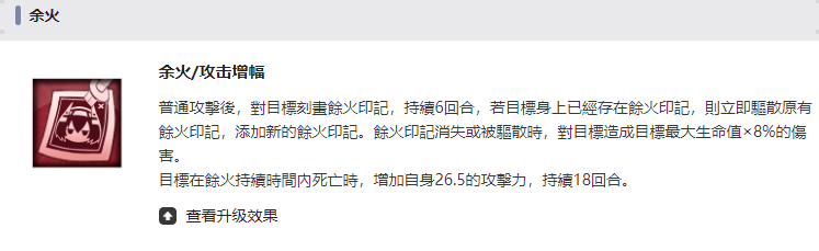 另外还有余火,当你用了这个技能后。接着再使用普通攻击就可以对敌人施加印记,对方身上已经有印记的话,那这种印记就会马上消失。并且附加新的印记,消失期间就会瞬间对敌人造成8%的最大生命值伤害。要是对方在此期间死亡的话,可获得26.5的攻击力加成。
