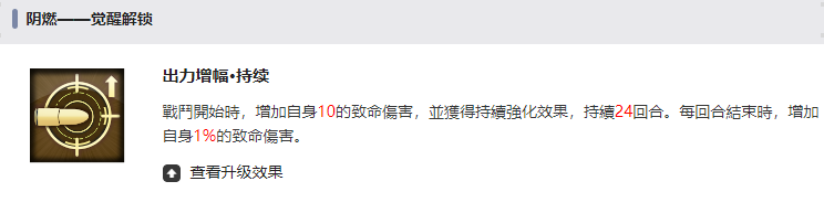 当他觉醒的话,就可以成功解锁阴燃。这是一招增幅能力特别强的技能,刚开始时就可以增加10点的致命伤害。持续获得强化效果,连续多达24个回合。每当回合结束之后,都可以获得1%的致命伤害加成,所以这招让他变得越来越适应高强度的作战。