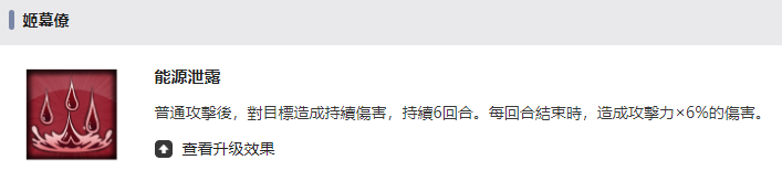 她的被动技能叫做姬幕僚,当他使用普通攻击。不仅可以对目标造成持续伤害,并且在每个回合结束时都可以获得高达6%的攻击力伤害加成。如此就可以让她轻松打出高额的持续伤害,并且还会不断通过叠加攻击力来获得更高伤害。