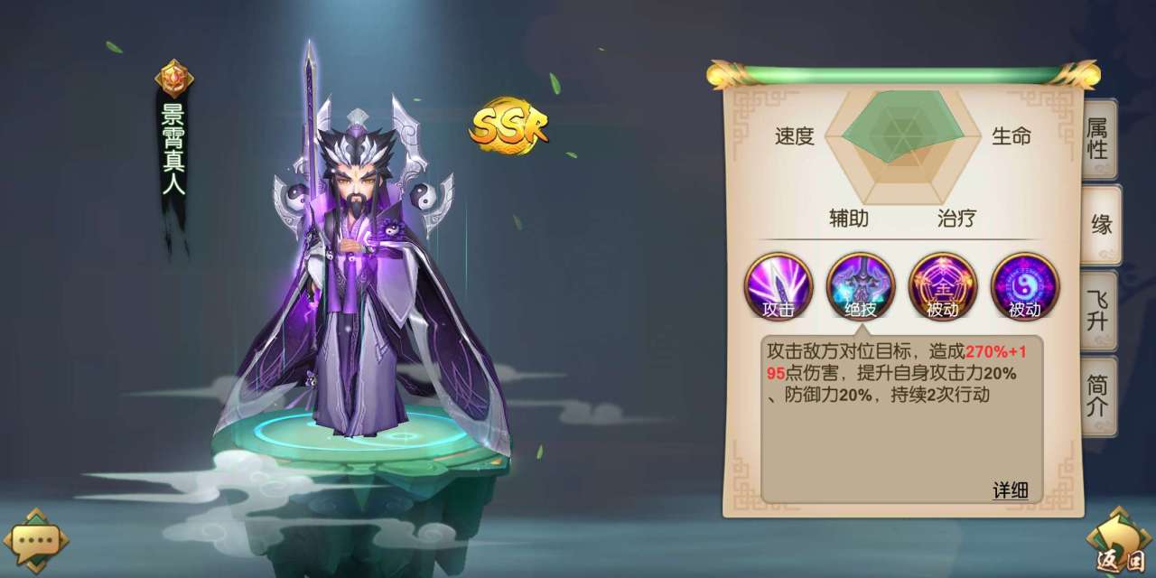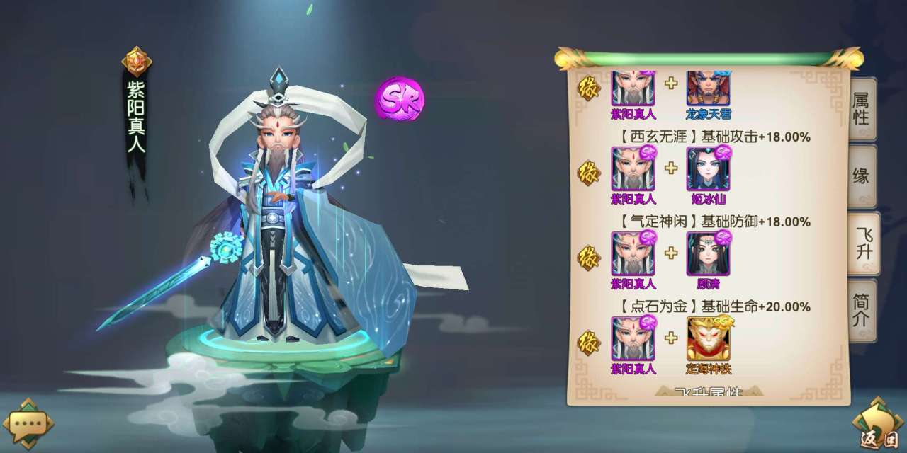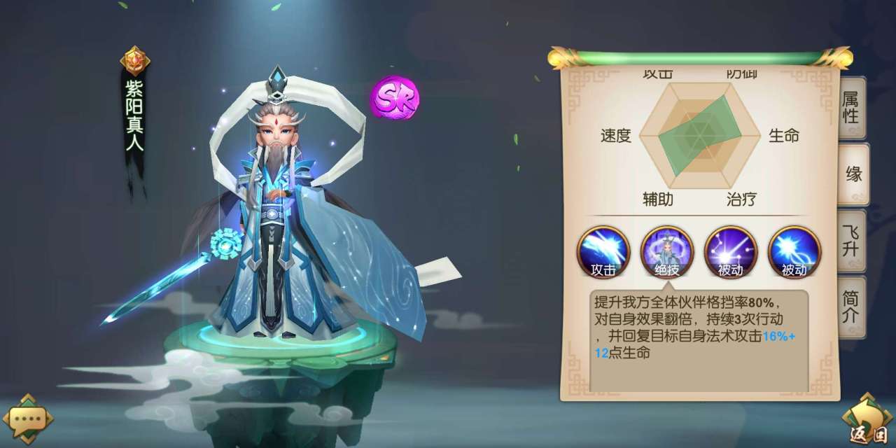 首先推荐的是SR级别的紫阳真人。紫阳真人是一名擅长提升全队格挡率的英雄,在给予队友提升格挡率的效果同时,还可以恢复自身的生命值,是一名不错的坦克型英雄。