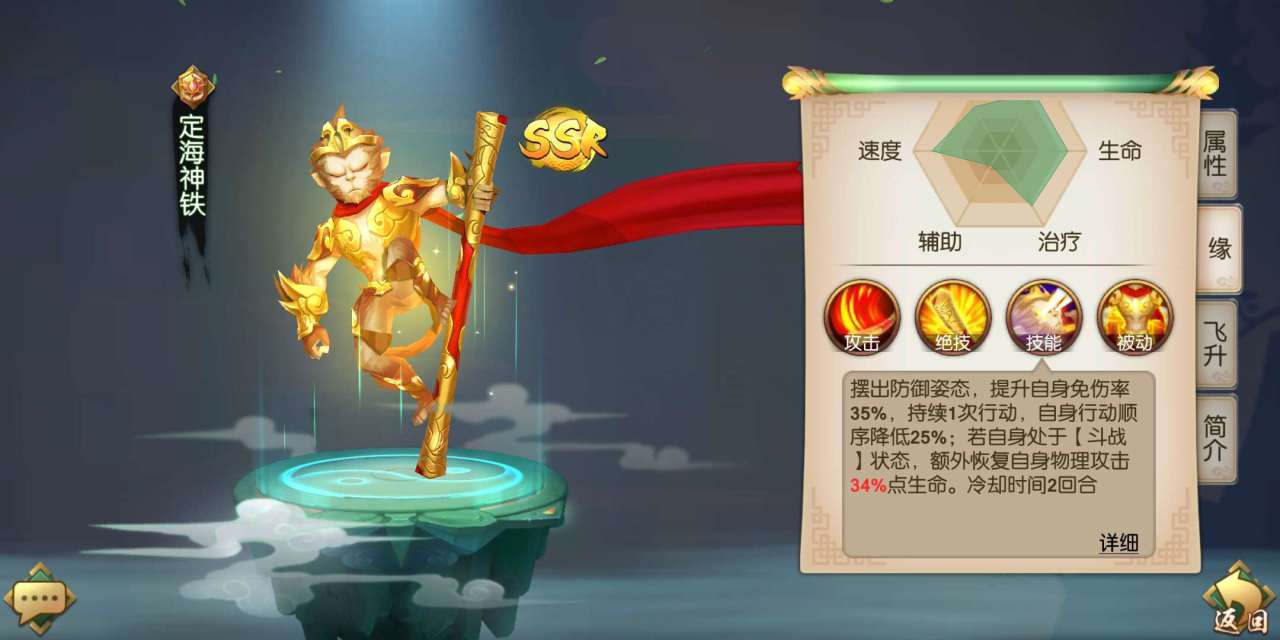 接下来要介绍的就是定海神铁了。定海神铁是一个比较特殊的英雄,虽然他的定位是坦克,但是他的特色是反击能力很强。定海神针能够给自己叠加斗战的状态,在斗战状态下他的反击率能够提升200%。再加上他自身的攻击力和生命值都很高,每次受到攻击都能够反击,间接提升了他的输出能力。所以定海神铁可以说是玩家必备的一名英雄。