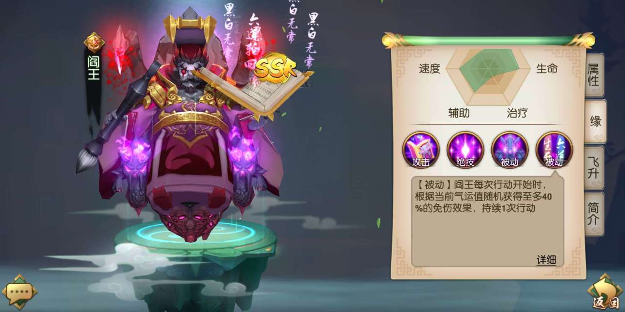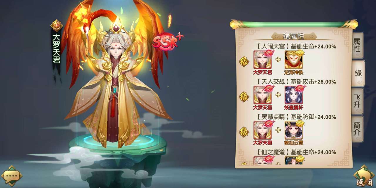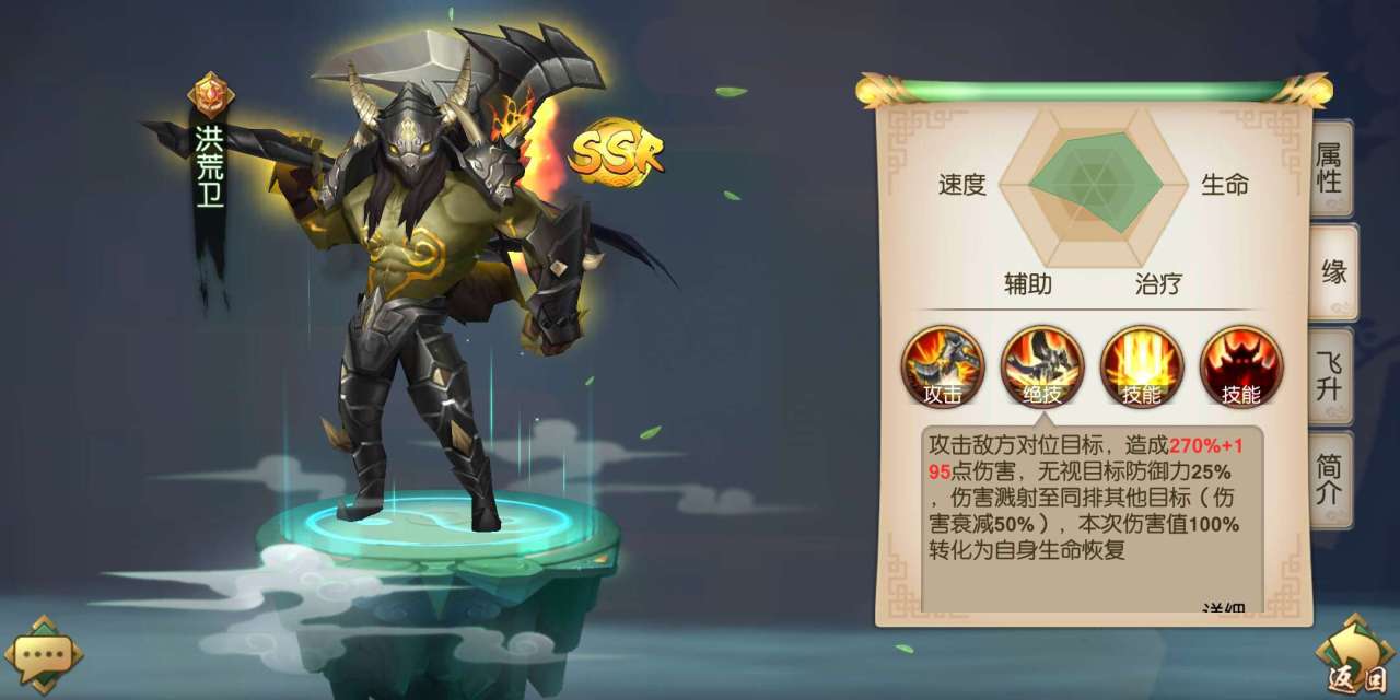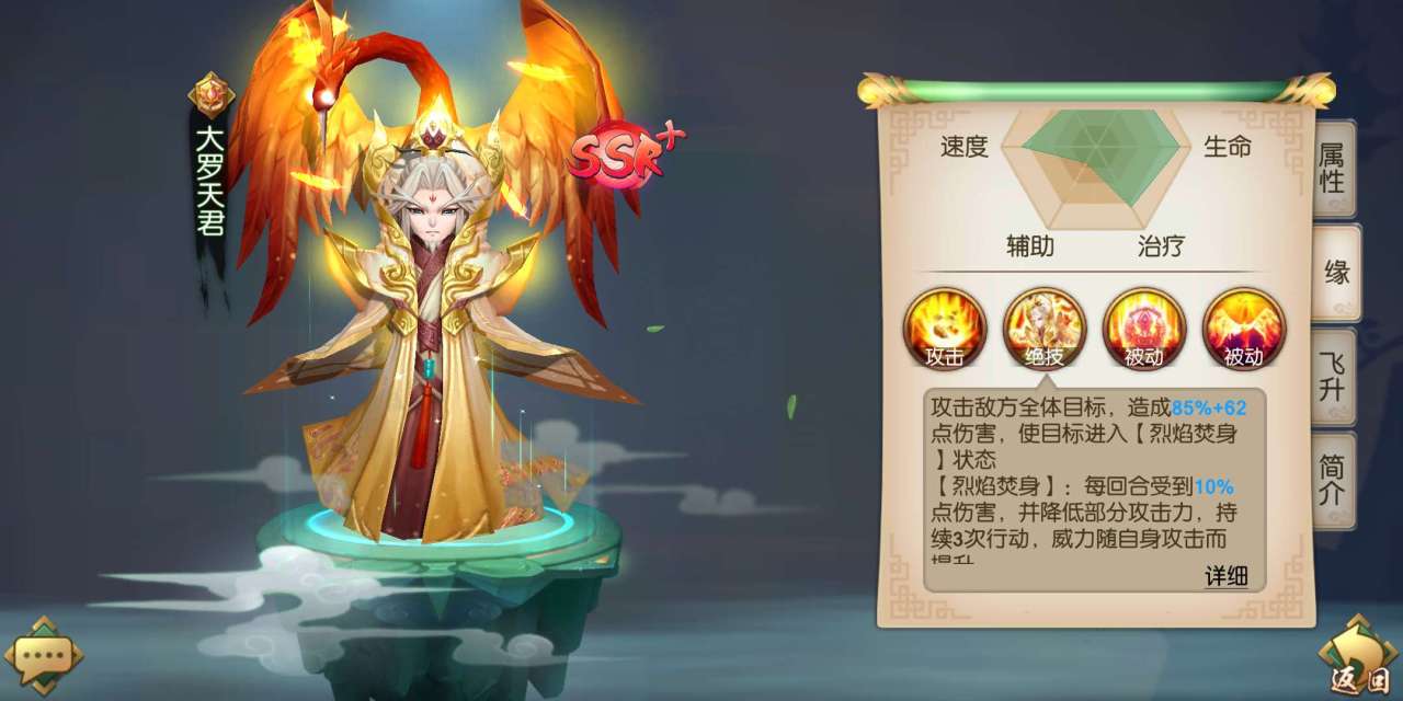大罗天君是SSR+的英雄,他的基础属性是非常优秀的,尤其在防御力、生命值和速度上面显得特别出色。他的绝技能够给敌方施加持续伤害的效果,同时在使用绝技后的三个回合,大罗天君的普攻还能够恢复自身生命值,使得他成为一名血量很厚,续航还很强的坦克。