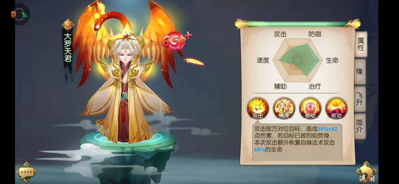 虽然没有治疗,不过并不是完全没有恢复能力,大罗天君是后期最为强悍的防御性英雄,被动技能仙炎重生使得大罗仙君在回合结束的时候,如果自身血量低于30%,则可以清除自身受到的DEBUFF影响,并且恢复全部生命值,每次战斗可以生效一次。