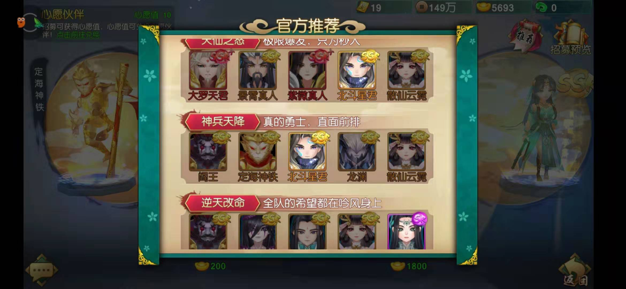 第二套阵容时攻守兼备的阵容,小编推荐的是大罗天君、定海神针、散仙云霓、青衣和北斗星君。在这套阵容里,大罗天君和定海神针在前排,其余英雄在后排。