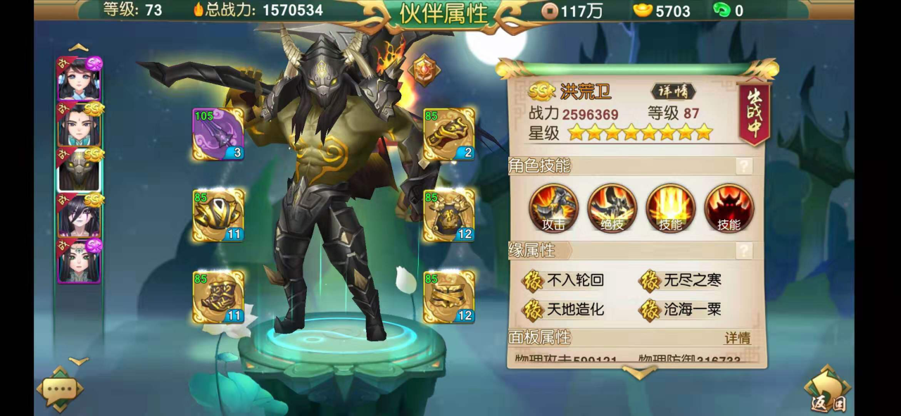 极限输出阵容的选择是洪荒卫、妖皇翼轩、龙渊、谪仙吟风和妖后文婉,洪荒卫的绝技技能在攻击单体目标的同时,无视目标25%的防御能力,并且造成50%伤害的溅射效果,溅射的范围的一排的全部敌方目标。同时本次伤害的10%还可以恢复自身的生命值,在没有恢复的阵容里,洪荒卫是活得最久的。